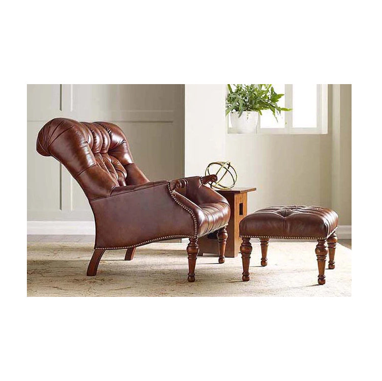 This remarkable chair is defined by its deep tufting and nailhead trim accents. A distinctive, gently sloping back and wraparound arms make it extremely comfortable, especially when combined with the coordinating ottoman.